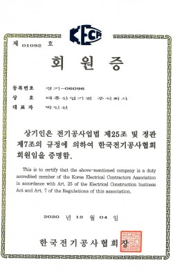 한국전기공사협회 가입 인증서